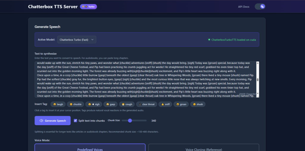 User Interface and Generating Workflow. The Chatterbox Turbo UI is exceptionally relaxed since you can just paste your text and apply any emotional tags that you desire to and be ready to receive a pleasant voice-synth experience. You will also require reference clip; which is that of your voice. Record a WAV file (lasting no more than 30 seconds, clear sound, no background noise) so that the model could copy you to the dot.