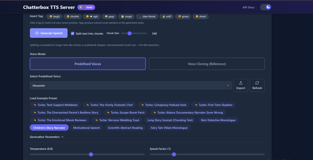 User Interface and Generating Workflow. The Chatterbox Turbo UI is exceptionally relaxed since you can just paste your text and apply any emotional tags that you desire to and be ready to receive a pleasant voice-synth experience. You will also require reference clip; which is that of your voice. Record a WAV file (lasting no more than 30 seconds, clear sound, no background noise) so that the model could copy you to the dot.